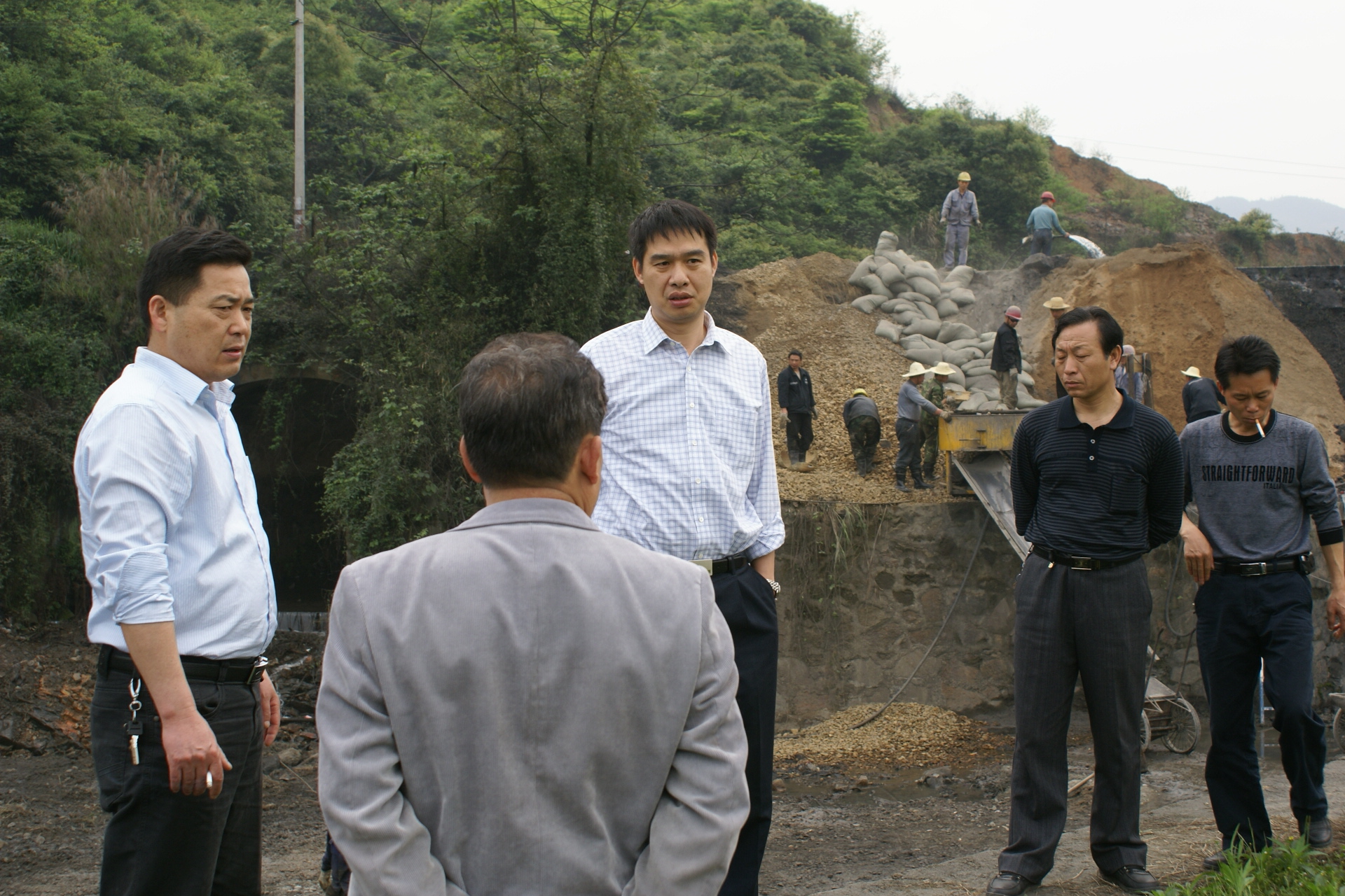 南阳矿业公司加大前进矿“神仙洞”治理,将其作为重中之重抓紧实施,真正消除“蚁穴”,筑牢“长堤”,确保防治水工作有备无患,万无一失。图为该公司总经理石武军(右三)、生产副总袁振华(左一)在“神仙洞”注浆工地督导施工。