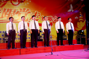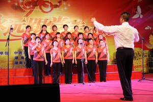 图为公司机关退休员工代表队合唱歌曲《太阳最红毛主席最亲》。