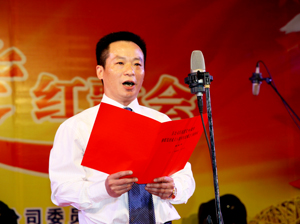 图为白山坪公司党委书记陈秋华在红歌晚会上致词。杨敬忠摄
