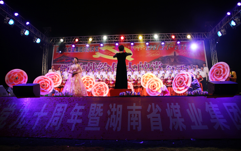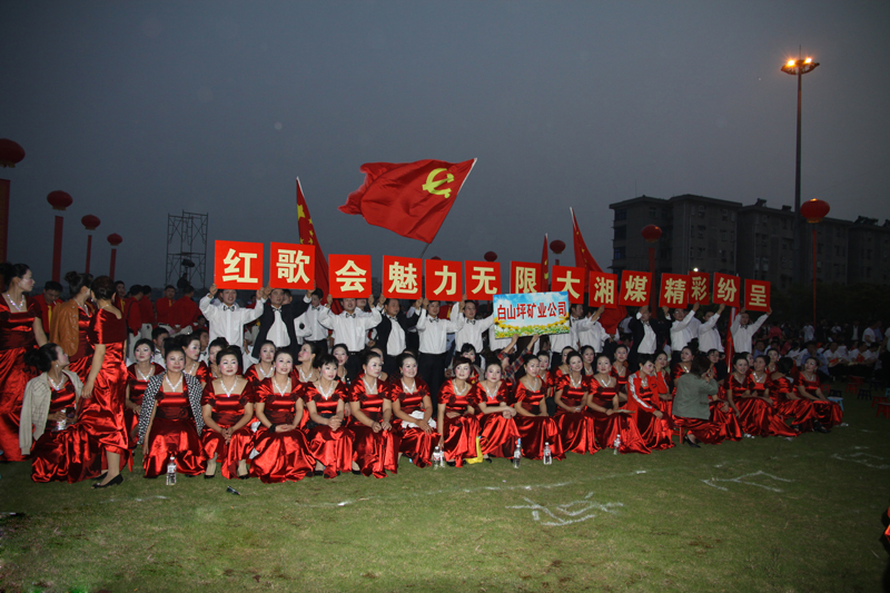 5月26日晚白沙片区隆重举办红歌晚会。图为白山坪公司红歌合唱团演职人员方正队在晚会演出现场展示良好的精神风貌。
