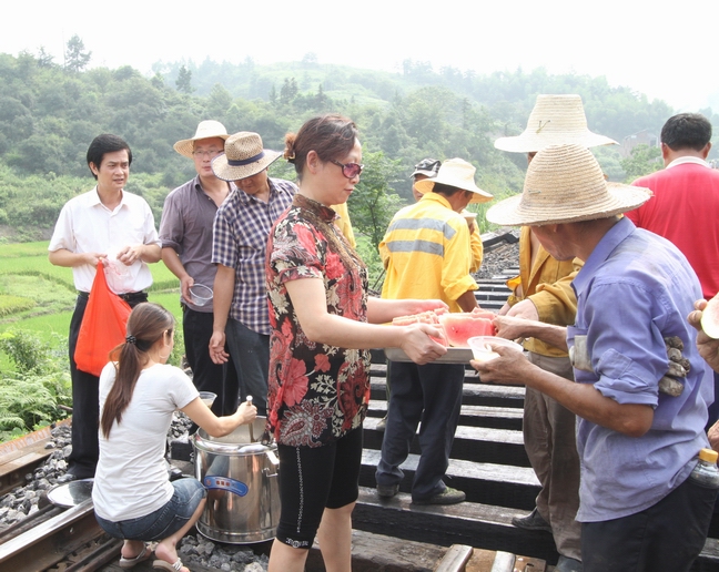 野外作业现场烈日当头、职工体力消耗大,为保证一线职工不中暑,体力不透支,以充沛的体力和精力投入安全生产,公司工会组织女工、家属分批将清凉解暑的绿豆汤、凉茶、西瓜等送到职工手中。积极为职工生产生活营造阵阵凉意。