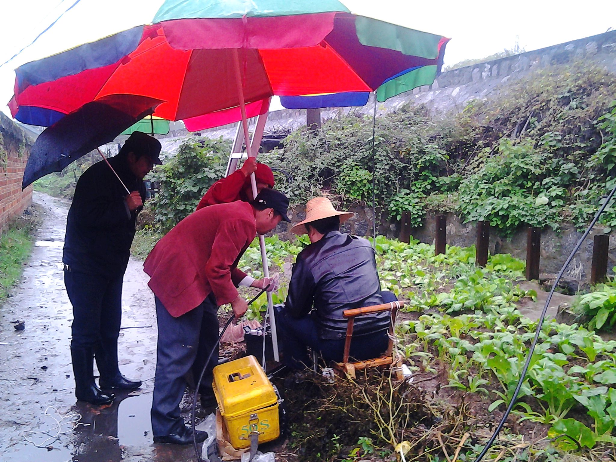 图为抢修队员冒雨抢修第二个光纤盒