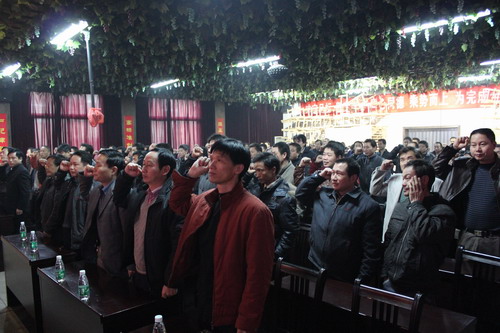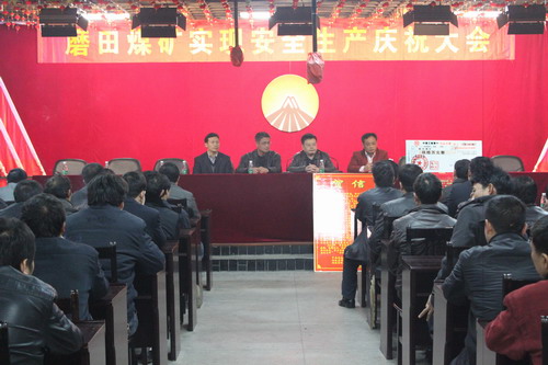 这一天,磨田矿区热闹非凡,矿区内彩旗飘扬,灯笼高挂,到处都洋溢着喜庆的氛围。在一阵热闹的鞭炮声和欢快的腰鼓声中,迎接了公司领导一行。在矿文化楼大礼堂里,磨田煤矿召开了简单而隆重的庆功会,全体与会人员进行了集体安全宣誓。会上,公司副总经理周晓明代表公司宣读了党、政、工送来的贺信,并向全矿干群和家属致以亲切的问候和新年祝福。贺信中,充分肯定了磨田煤矿在2011年为公司安全生产作出的突出贡献,并希望在2012年里,再接再厉,戒骄戒躁,再创佳绩,为建设“平安白山坪”、“和谐白山坪”做出更大贡献。