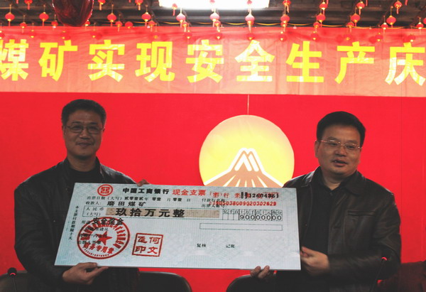 公司董事长、总经理何文飞在会场为磨田矿颁发了安全年90万元奖金,并发表了热情洋溢的讲话,他在肯定了磨田煤矿在2011年取得的突出成绩。同时,简单地介绍了公司2012年的主要思路和重点工作,决心在磨田煤矿通过2-3年时间,从井下到地面,全力打造全湘煤一流的矿井,希望通过磨田全体干群与公司的共同努力,实现这个崭新的目标。