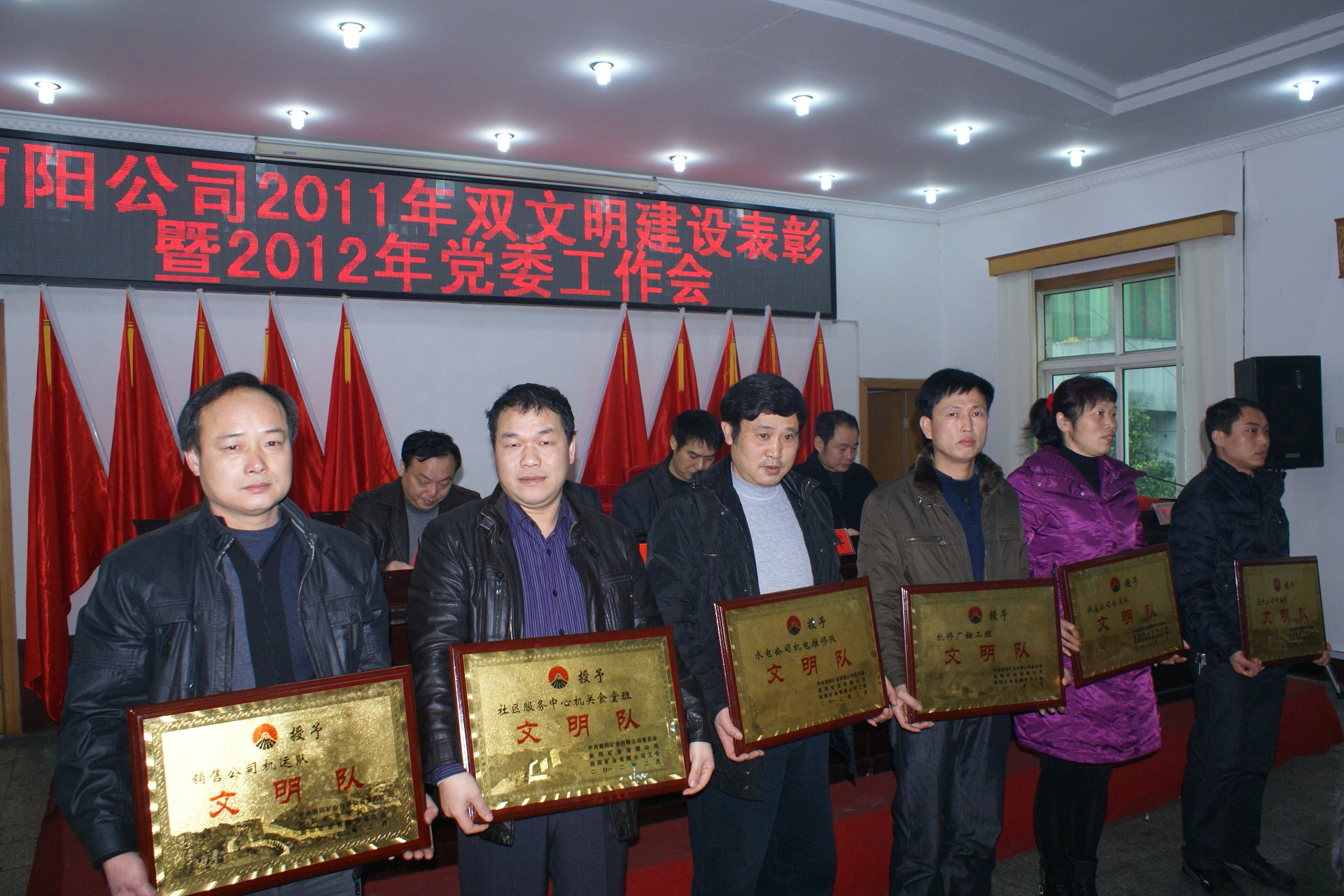 2月16日,南阳矿业公司2011年双文明表彰暨2012年党委工作会在激昂的国歌声中拉开序幕。会上对5个“文明单位”、7个“文明部室”、14个“文明队(组)”、10名“劳动模范”、210位“文明员工”、20名“主题活动”先进个人,1个“四好领导班子”、“十佳”党支部书记、“十佳”采掘队干和“十佳”明星班组长和9名“优秀中级职员”进行了表彰。