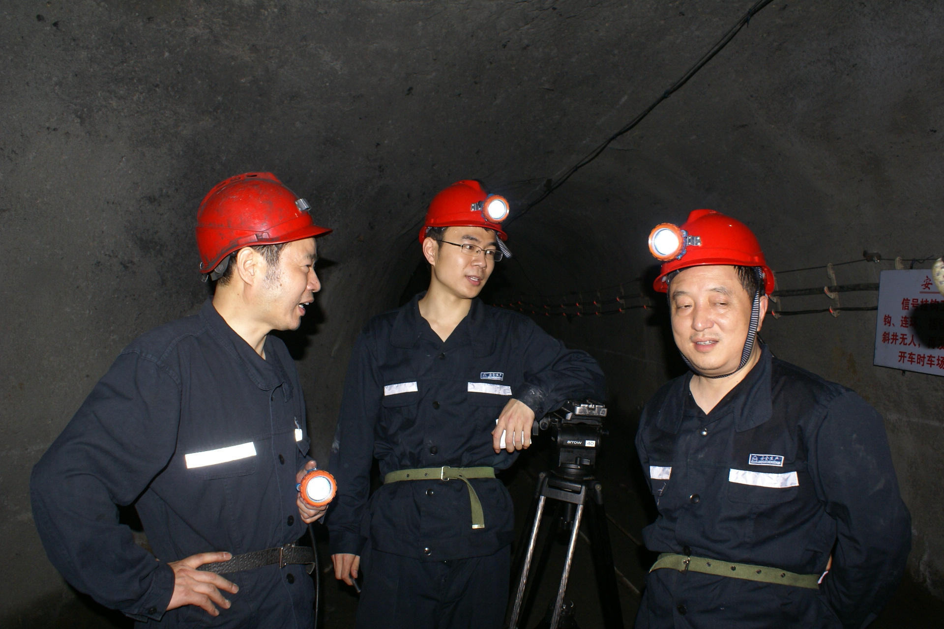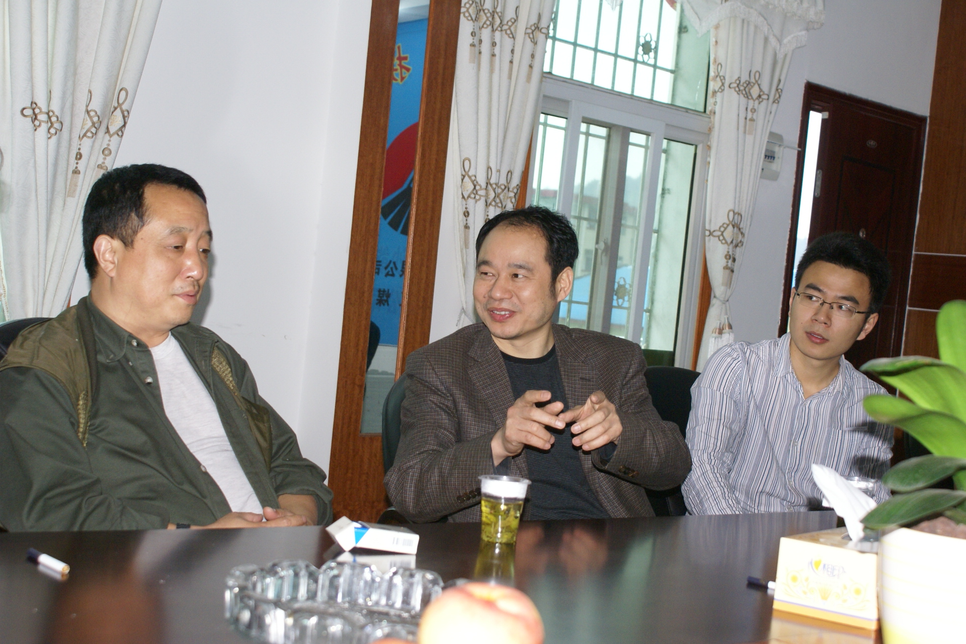 南阳矿业公司党委书记谭景茂与新华社湖南分社记者范军威(左)、谭畅(左)亲切交谈