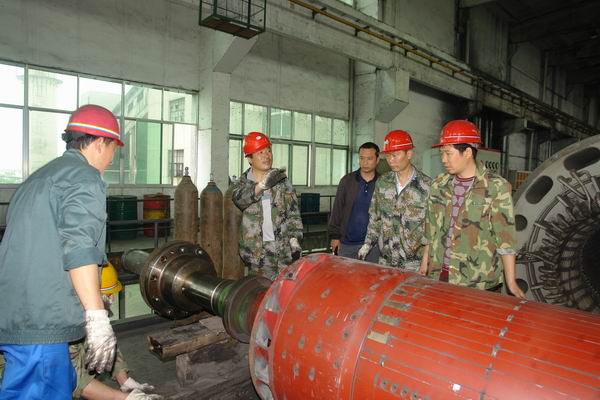 图九:电气检修人员正在为如何安全吊出发电机转子而开动脑筋