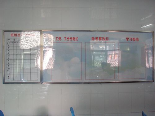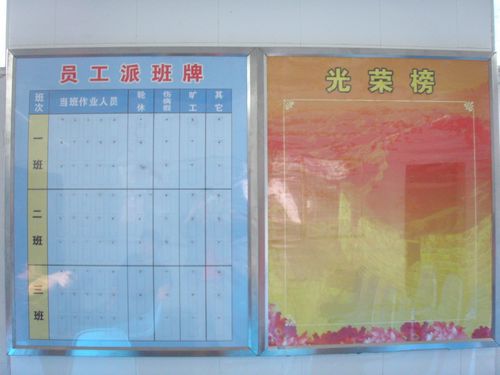 几天来,员工走进学习室,里面有一种赏心悦目的感觉,原来洁白的墙壁上忽然多了许多牌板,有“民主公开栏、工资、工分分配栏、安全誓词、隐患整改栏、学习园地、班组生产竞赛栏、员工全家福、员工派班栏、光荣榜、还有每班交待工作事项的黑板”。这些栏板的装饰,让墙面显得美观漂亮,更重要的是,让员工班前感觉到自己将在工作中所肩负的责任,增强了他们作业安全行为的自觉性。
