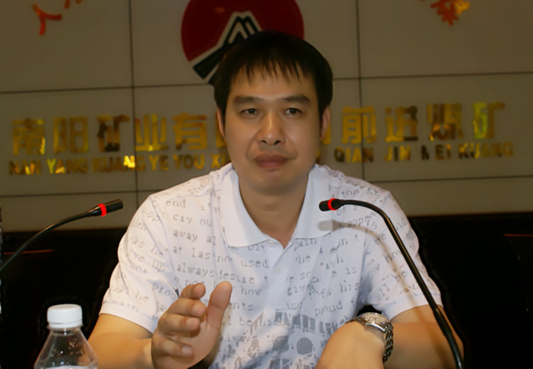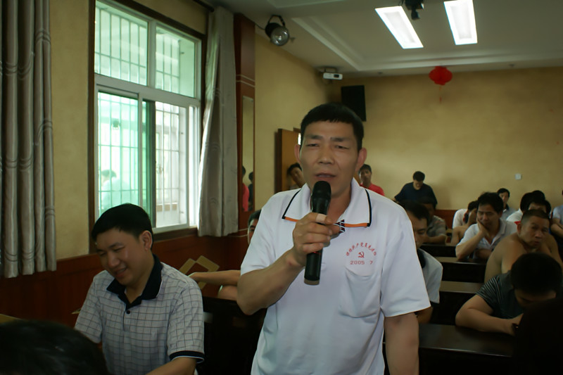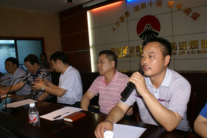 前进矿矿长尹仲初(左一)面对员工回答石总所出的安全题目