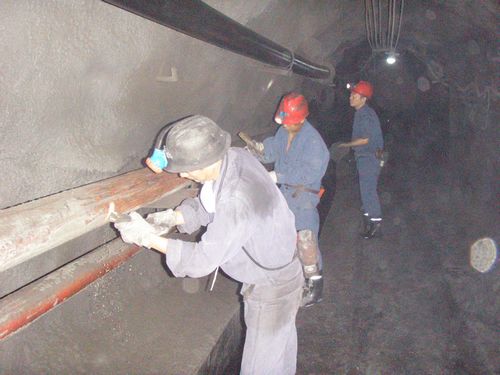 该矿—400南大巷由于改造过程中喷浆时,导致了一路的风管、水管、抽放管都凝固了水泥浆,为让这一路的管线变得漂亮美观,机关工作人员分两班进行刮、擦水泥和刷漆,副矿长李爱民中班亲自带队,或刮、或擦、或敲击、清洗,使用了多种工具,清除管线水泥400余米。晚班即将管线分颜色刷漆。