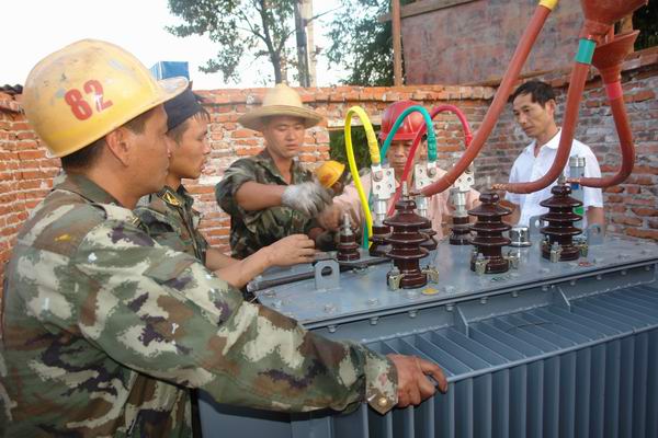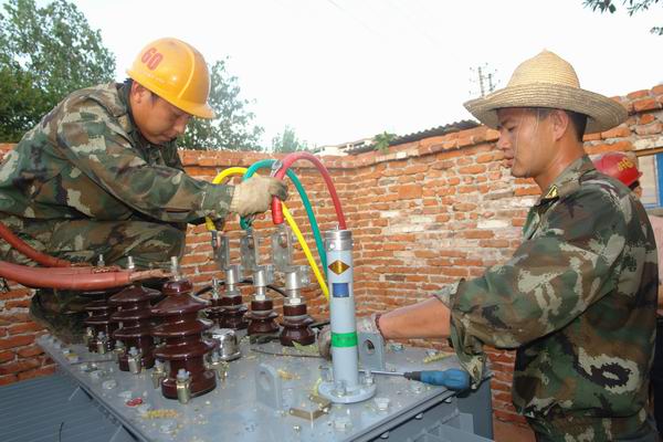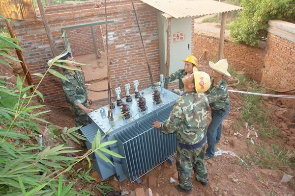 图六:供电所一线员工正在为更换新的变压器接线