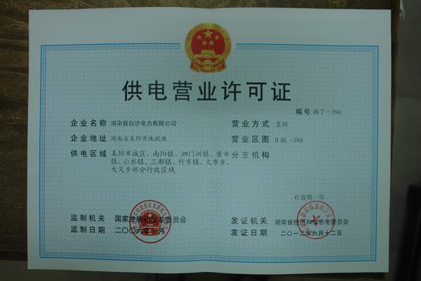 2011年12月,经衡阳市经信委审核,2012年6月经省经信委会审定,考虑到白沙电力公司的实际情况,本着尊重历史,以关爱职工群众生活,维护大局稳定为原则,以湘经能源[2012]284号文下发了《关于给茶陵县龙下工业有限公司和湖南省白沙电力有限公司发放<供电营业证>的通知》,并为公司发放了《供电营业许可证》(有效期一年),明确了白沙电力公司的供电区域,并明令要求,白沙电力公司不得擅自扩大供电区域,否则,将收回《供电营业许可证》。
