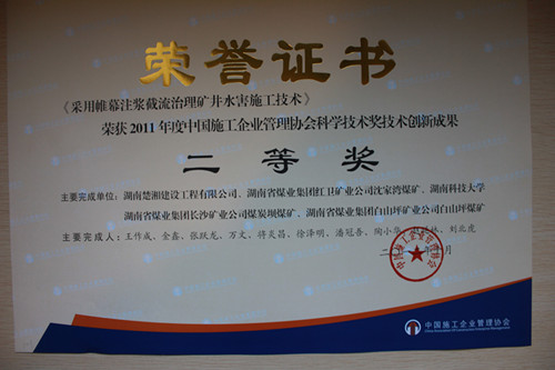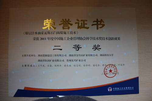 从10月30日中国施工企业科技工作会暨颁奖会上获讯:湘煤集团楚湘公司今年报送的《煤层注水抽放瓦斯石门揭煤施工技术>》及《采用帷幕注浆截流治理矿井水害施工技术>》二项科技创新成果分别获国家级二等奖,中国施工企业管理协会为该公司颁发了奖牌和荣誉证书。