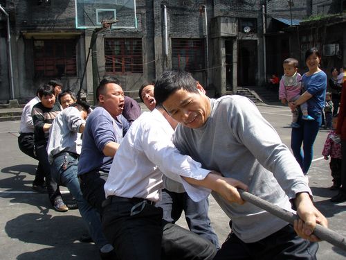上午8.30分,昔日一派繁忙景象的矿区,此时更是热闹异常、喜气洋洋。耒阳白山坪学校100余名师生组成的方队,有鲜花、旗帜、标语以及挑着慰问品的老师和学生,他们一路喊着口号:“采掘工人叔叔们辛苦了,祝采掘工人平安吉祥”,徐徐走向白山坪煤矿井口,让所有围观群众感动不已,到了井口,众师生还就地表演了舞蹈、歌曲、诗朗诵等节目,学校活动之后,矿里随即召开了表彰大会,对优秀采掘工人进行了表彰,他们披挂印有“最佳采掘工人”的授带和手捧荣誉证书,亮相台上,赢得了广大员工群众经久不息的掌声,公司副总经理罗秋德出席了表彰大会,并发表了热情洋溢的讲话,随着主持人矿党总支书记杨伟忠的一声散会,会议虽已落幕,可庆祝活动的好戏却在后头,拔河比赛,由各连队挑选出来的“重量级”人物,进行实力比拼,比赛以循环赛方式决出胜负。哨声响起,比赛双方你拉我扯,丝毫不让,两边加油助威声不绝于耳,更增加了比赛双方的激烈,经过几轮角逐,最终采二队以绝对优势夺得比赛冠军,岩掘队荣获亚军。