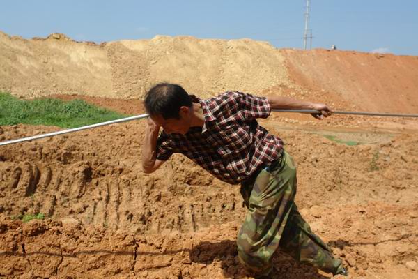 该机关人员早上6点即出发来到工地。线路总长500米,因跨度大、距离长,给拖线放线带来极大困难,尤其是平素做体力劳动相对较少的机关工作人员,冒着地表温度近40度的高温,在高温炙烤下的铝线更是热得发烫,他们克服高气温高强度,出大力流大汗,排成一条长龙,恰似烈日下的“纤夫”,吃力地向前爬行,豆大的汗珠顺着脸颊不停地往下淌,衣服被汗渍浸出一圈一圈白色盐垢,尽管累得浑身无力,腿打颤,有的甚至手心都磨出了血,但他们仍坚持在10点半钟之前放完一根避雷线、两根95平方的铝芯电线。为了合理安排时间,防止高温下中暑,他们避开正午毒辣的太阳,吃了工作餐就地休息。下午5点半接着继续放另一根95平方的铝芯电线,直到夕阳西下。经过从早到晚一天的劳作,共施放3根95平方的铝芯电线,1根避雷线,往返距离4000余米。