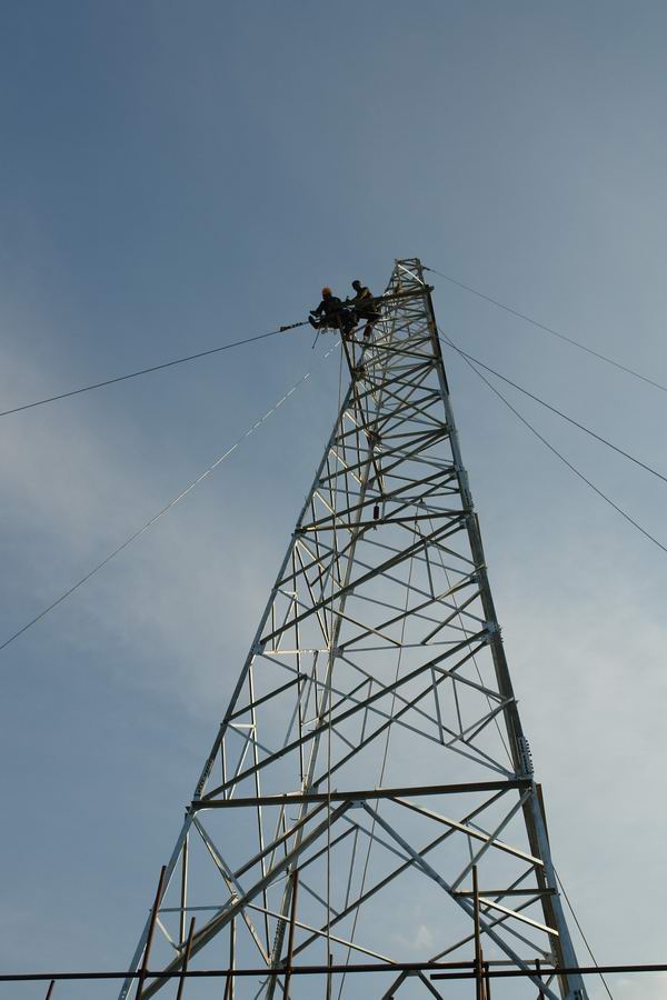 图四:夕阳西下,供电所员工仍在十几米高的铁塔上作业