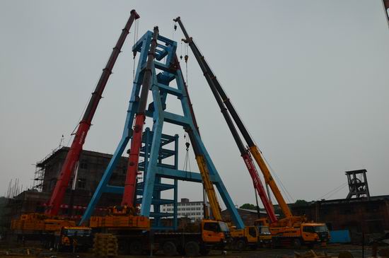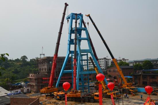 15时58分,随着井架的最后一个部件吊装完毕,高36米,重235吨的湖南省乃至南方煤矿第一高度钢井架顺利吊装成功,而此次钢井架吊装的难度、复杂程度在湖南省尚属首次。
