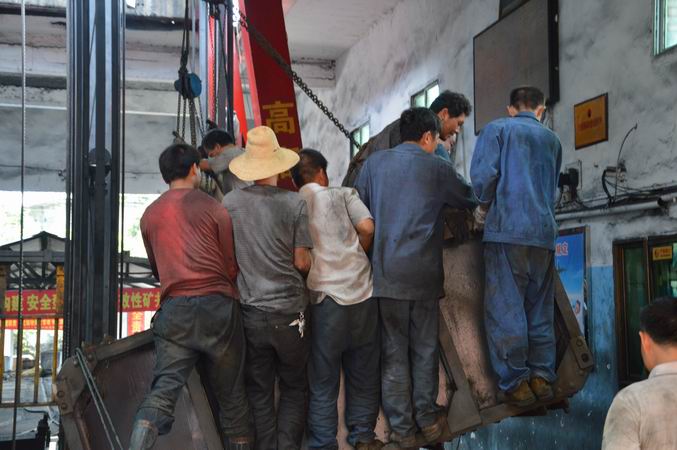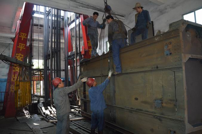 ,为增加主井罐笼运输提升的安全性,保证员工出入井的人身安全,磨田煤矿利用检修日对主井南罐笼进行了更换。