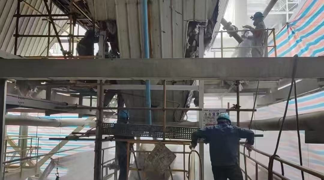 1 月 20 日,正值雨雪冰冻天气能源保供关键期,白沙新能源益阳电厂 #4 锅炉低省煤器突发泄漏,高温带水烟气直冲 #4 电除尘一电场 418 灰斗,导致内部积灰遇水严重板结,输灰系统濒临瘫痪,机组正常运行遭遇严峻挑战,能源保供工作刻不容缓。