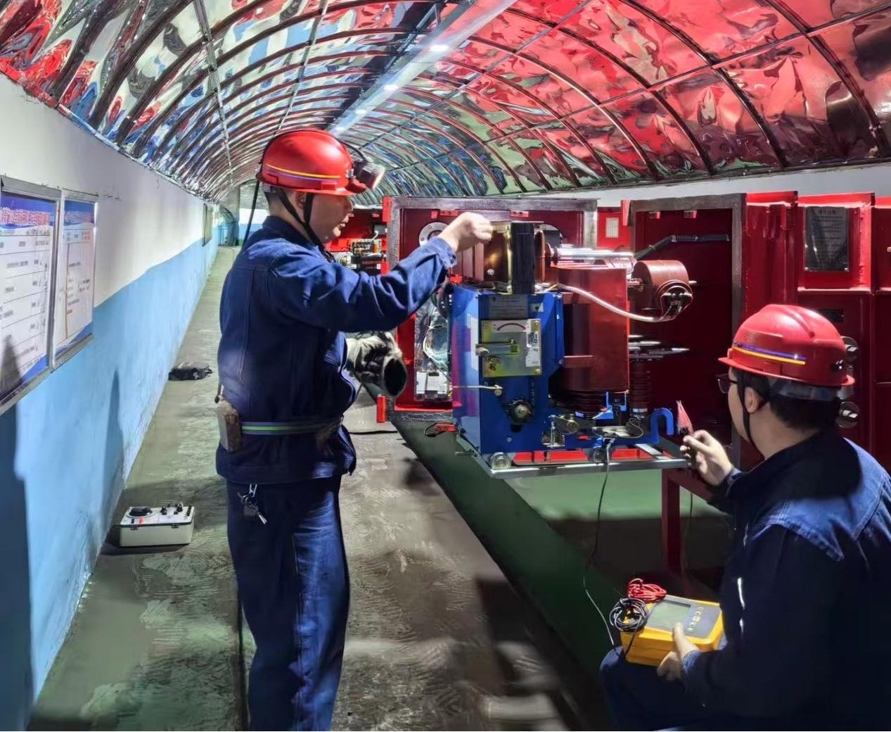 该公司党员骨干牵头组建的先锋队冲锋在前、实干在先,以党建红引领技术蓝,为矿区供电安全筑牢坚实防线。党员主动挑重担,牵头制定同步作业方案,带领团队兵分两路开展地面与井下同步作业。从继电保护定值校验到绝缘电阻测试,严格对标行业规程,严把质量关,每一组数据记录都力求精准无误,以匠心与细致完成了此次全方位的设备“问诊”。该团队以持续跟踪服务为抓手,为矿方建立起设备动态健康档案,实现了从单一的设备预防性试验,向全周期、全流程技术服务的升级跨越。“连续三年由你们来做,设备数据有延续性,党员师傅们技术硬、服务细,我们用得更放心。”山晓煤业机电负责人罗经理的一席话,是对“白沙试验”专业能力的高度认可,更是对党员先锋队实干担当的充分肯定。