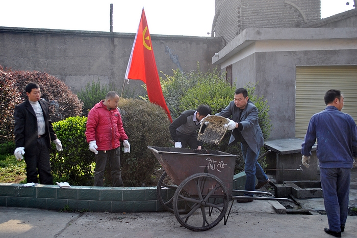 图为觉光寺矿团员和青年志愿者正在清理水沟,花坛杂物